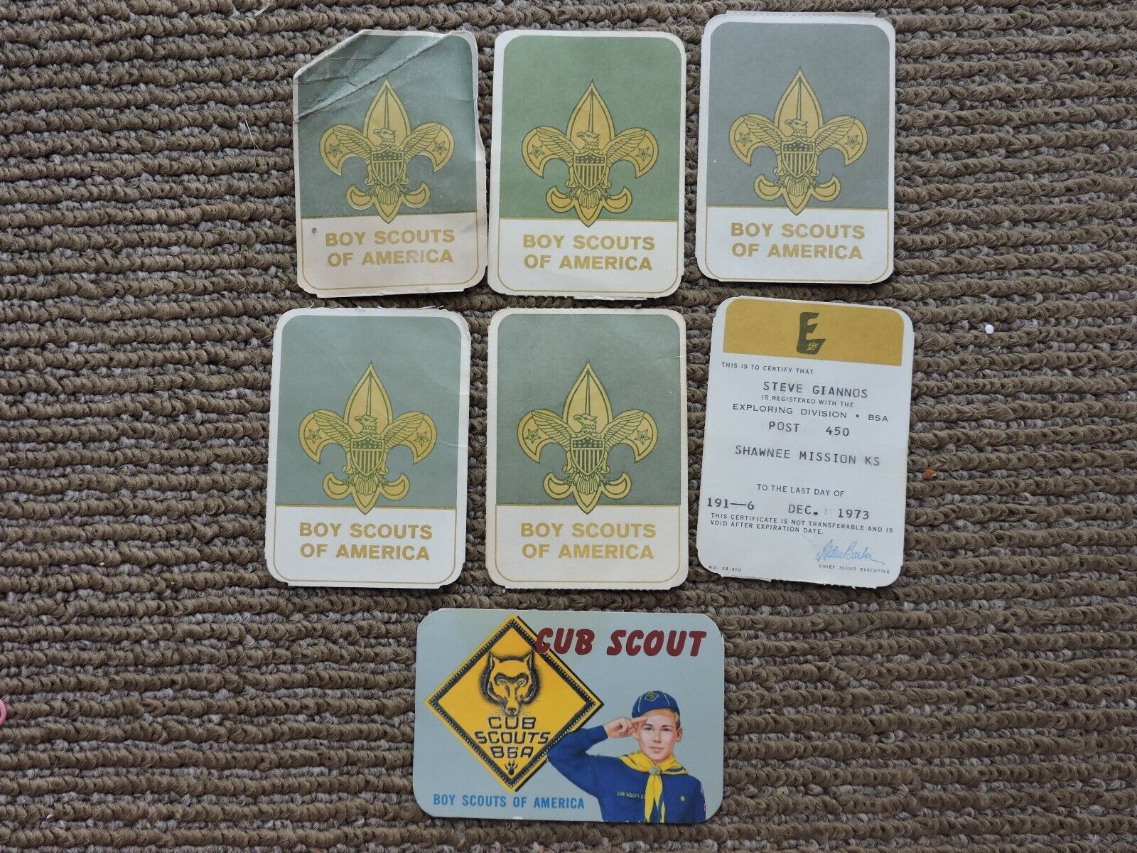 One Boys Journey-Cub Scout to Boy Scout to Explorer Membership Cards